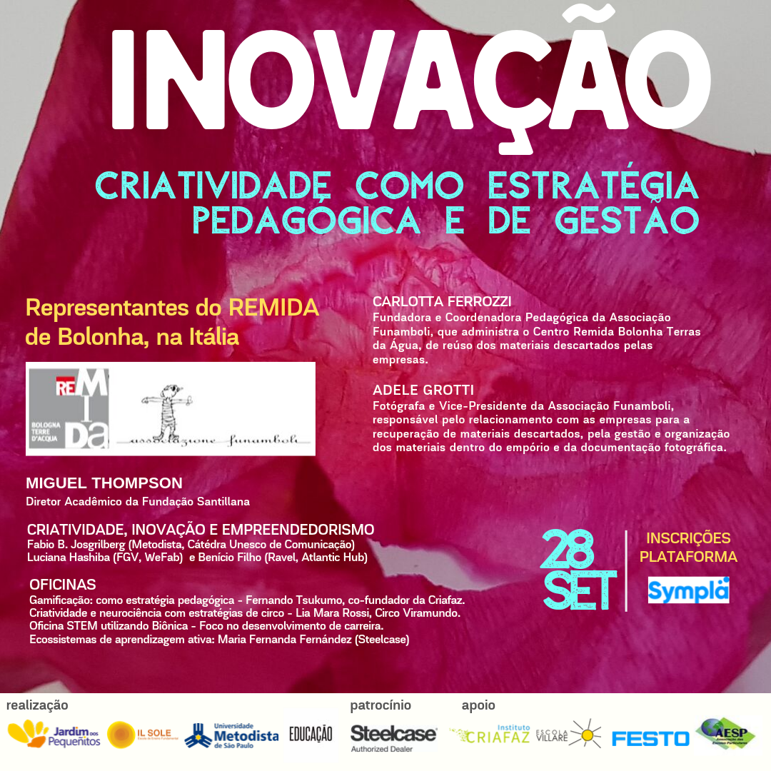 Princípios, metodologias e estratégias sobre como fomentar criatividade e inovação estarão em debate em 28 de setembro próximo na Universidade Metodista de São Paulo no seminário Inovação na Escola – Criatividade Como Estratégia Pedagógica e de Gestão, focado em gestores e profissionais da educação que lideram projetos de inovação