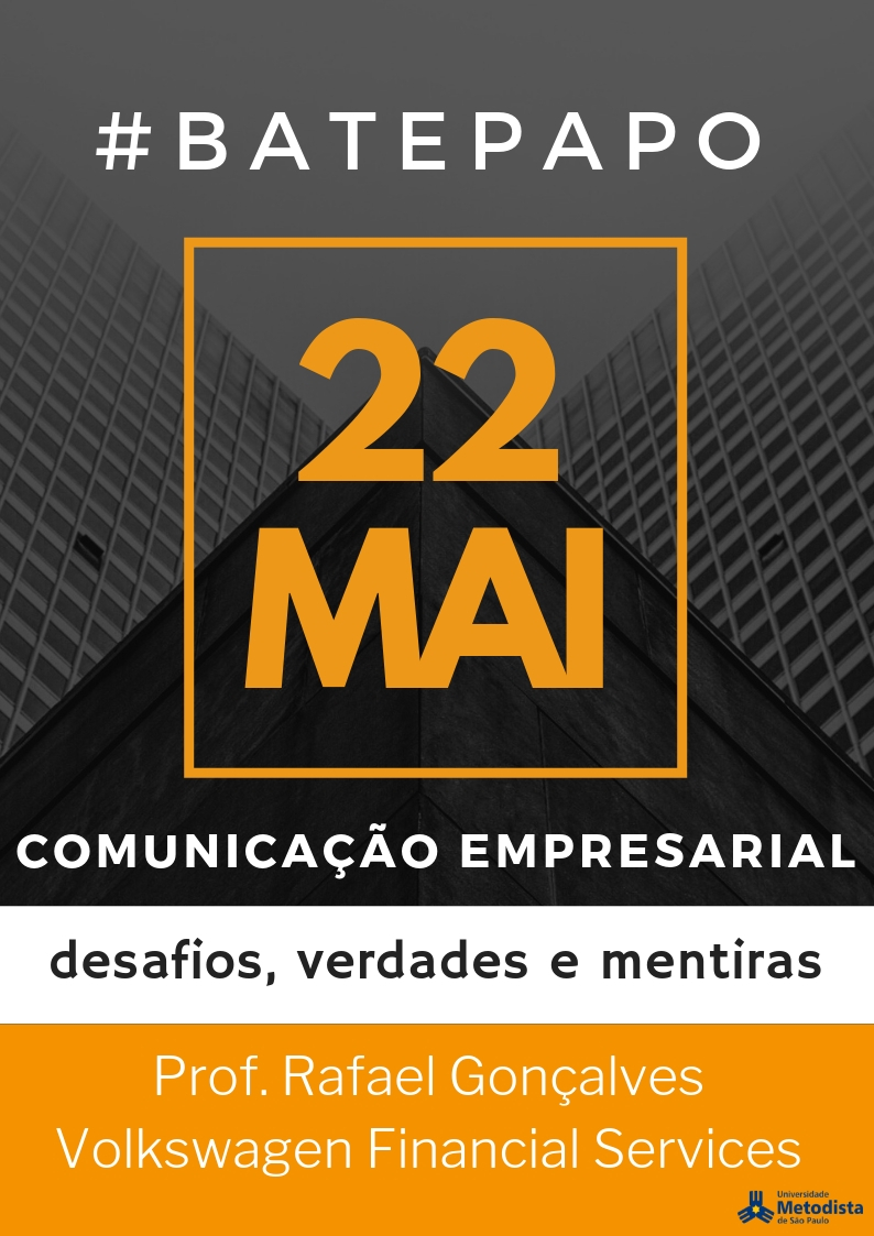 A Universidade Metodista de São Paulo promove na noite de 22 de maio de 2019 bate-papo sobre Comunicação Empresarial: desafios, verdades e mentiras com o professor e doutorando do Programa de Pós-graduação em Comunicação Social da Metodista, Rafael Gonçalves.