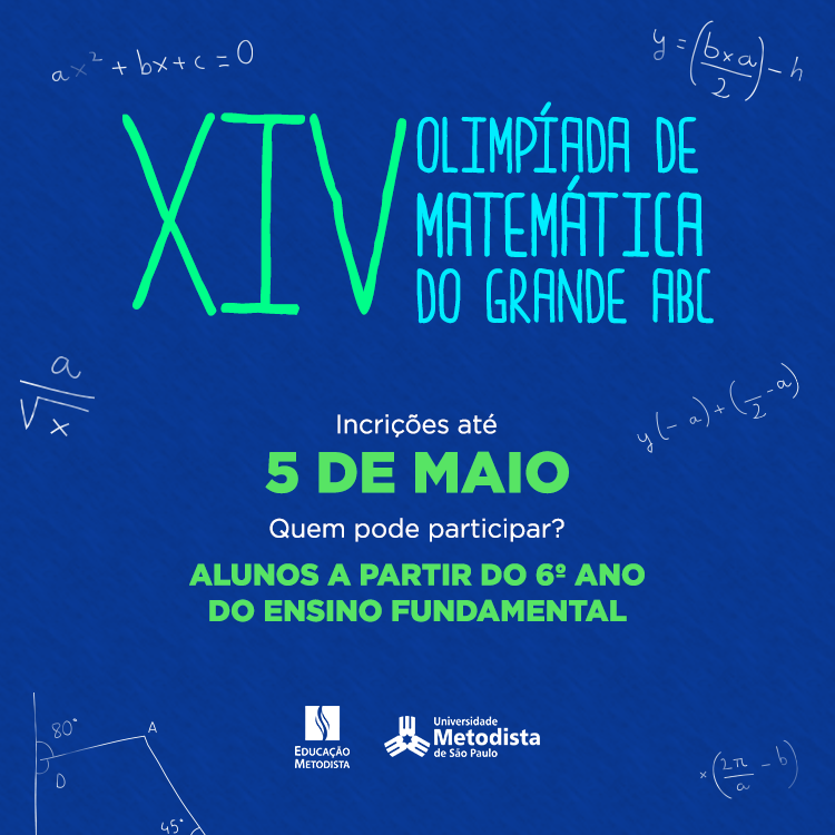 Estão abertas até 10 de maio as inscrições para a 14ª edição da Olimpíada de Matemática do Grande ABC. A iniciativa é organizada pelo curso de Matemática da Universidade Metodista de São Paulo em parceria com a Escola de Engenharias, Tecnologia e Informação e da Escola de Comunicação, Educação e Humanidades. A primeira fase da prova acontece em 10 de junho e a segunda em 21 de outubro.