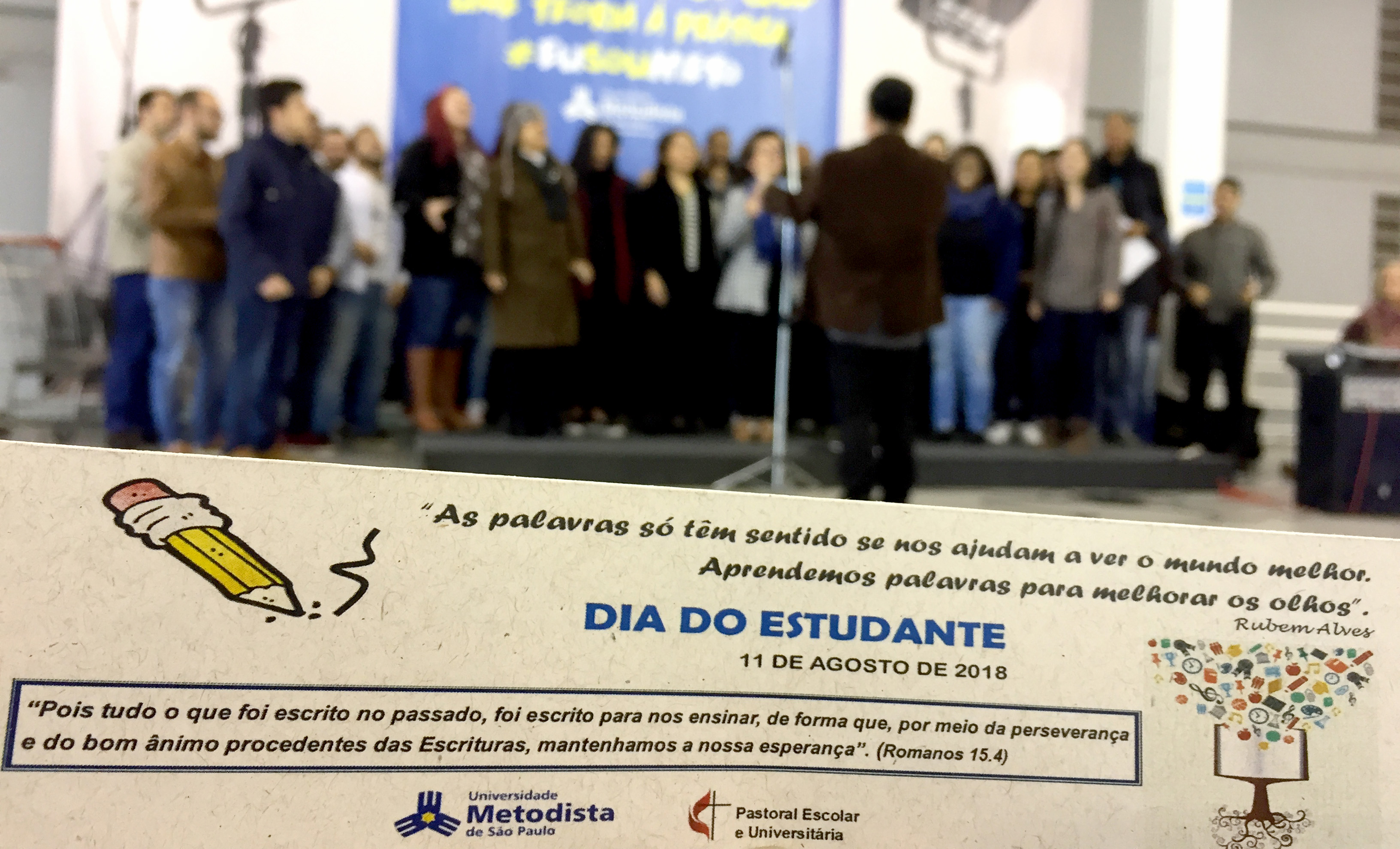 O Dia do Estudante não passou em branco na Universidade Metodista de São Paulo. A data, celebrada em 11 de agosto, foi lembrada pela Pastoral Escolar e Universitária por meio de apresentações artísticas do Coral Canto da Terra e do Grupo de Teatro da Escola de Teologia da Metodista. As duas homenagens foram promovidas no Centro de Convivência do campus Rudge Ramos às 12h10 e 21h10, de modo a interagir com alunos nos intervalos das refeições.