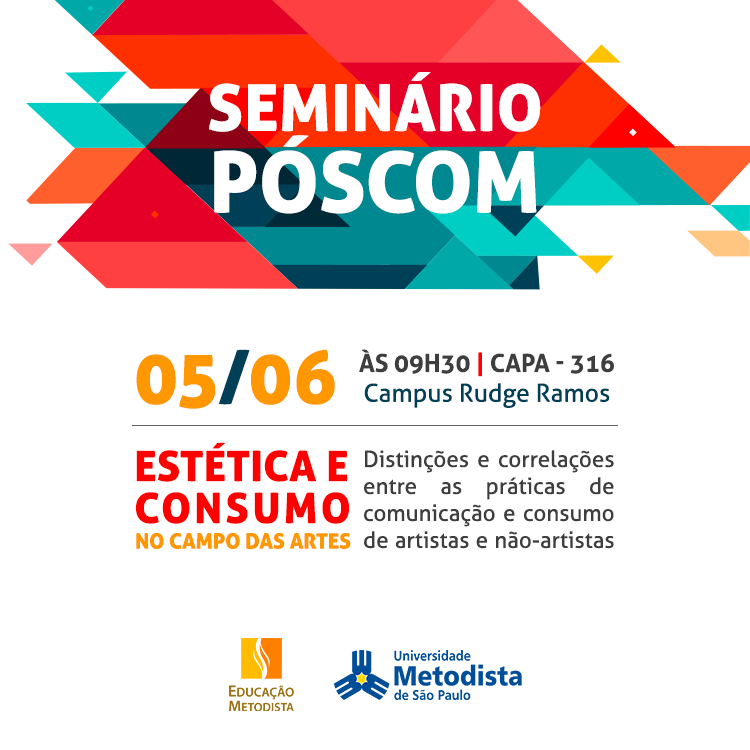 O Programa de Pós-Graduação em Comunicação Social da Universidade Metodista de São Paulo promove, nos dias 25 de abril, 15 de maio e 5 de junho, três seminários com a temática "Estética e Comunicação".