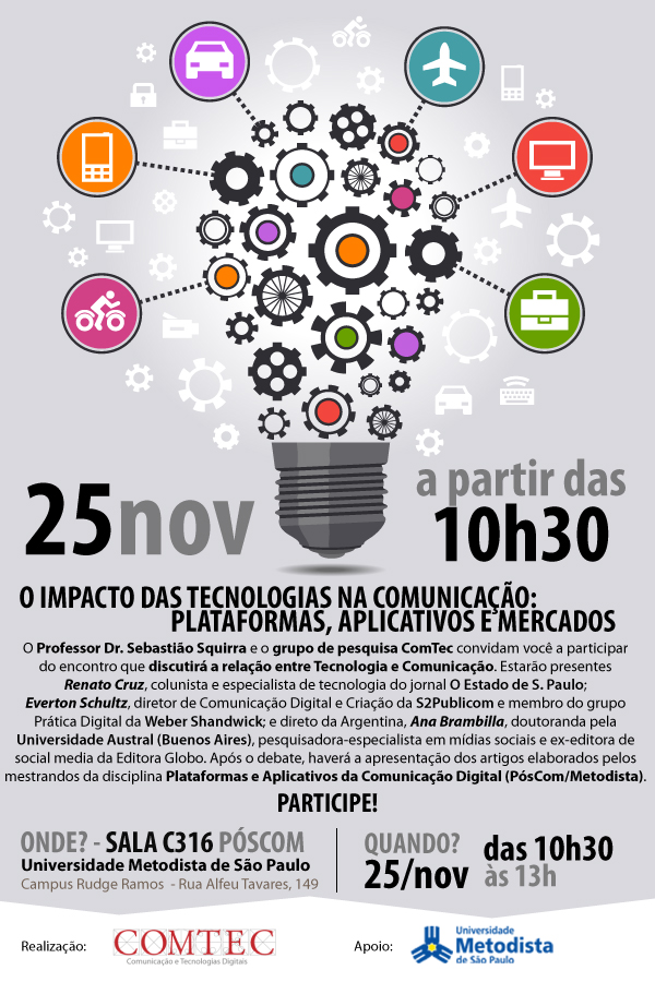 O Programa de Pós-graduação em Comunicação Social (Póscom) da Universidade Metodista de São Paulo, por meio do grupo de Pesquisa ComTec, promove um encontro entre alunos e profissionais para debater a relação entre Tecnologia e Comunicação. O evento “O impacto das tecnologias na comunicação: plataformas, aplicativos e mercados”, acontece nesta terça-feira, 25 de novembro, às 10h30.