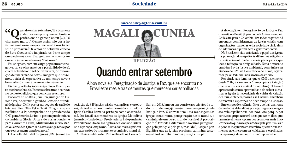 Publicada no dia 03, a coluna fala sobre o quanto ainda é possível ter esperanças e traz uma reflexão à respeito da presença de dirigentes do Conselho Mundial de Igrejas no Brasil neste mês, como o secretário-geral reverendo Olav Fykse Tveit, na chamada Peregrinação de Justiça e Paz enfatizado “o papel das igrejas na promoção do respeito às diferentes religiões e no fortalecimento da democracia participativa, que leve à redução da desigualdade”.