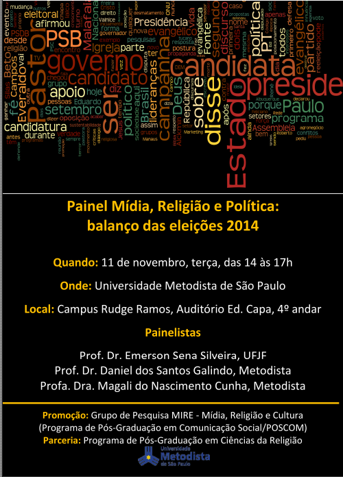 O Grupo de Pesquisa MIRE – Mídia, Religião e Cultura, do Programa de Pós-graduação em Comunicação Social, em parceria com o Programa de Pós-graduação em Ciências da Religião da Universidade Metodista de São Paulo promove, no dia 11 de novembro, um painel para realizar um balanço das eleições 2014, com destaque para a atuação dos grupos evangélicos e católico-romanos e a perspectiva da publicidade e do marketing.