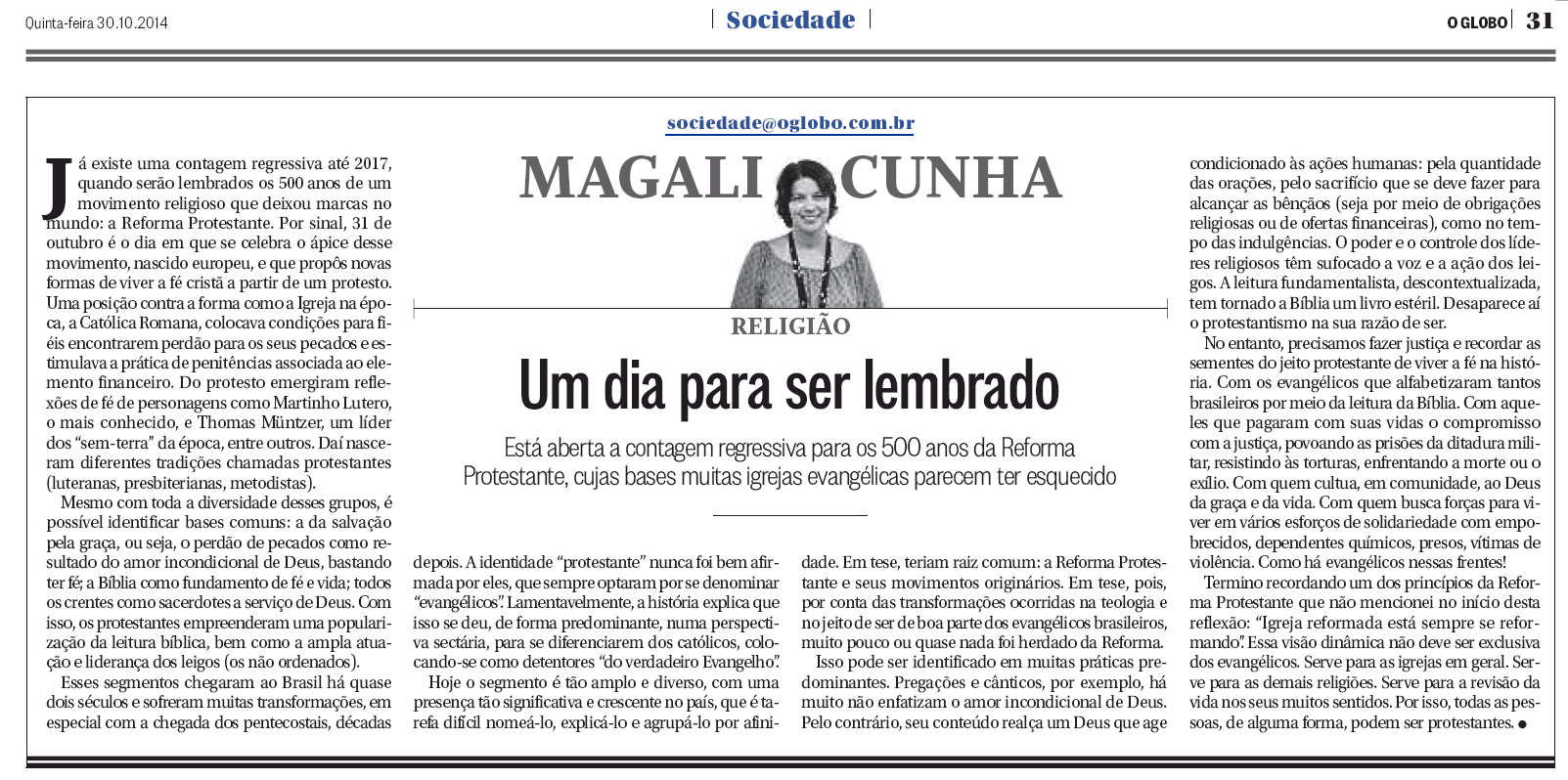 A professora doutora Magali Cunha, docente do Programa de Pós-graduação em Comunicação Social da Universidade Metodista de São Paulo, escreve quinzenalmente, às quintas-feiras, uma coluna para o jornal O Globo. Na edição publicada no dia 30 de outubro de 2014, o tema abordado foi sobre os 500 anos da Reforma Protestante e como muitas igrejas se afastaram um pouco deste propósito.