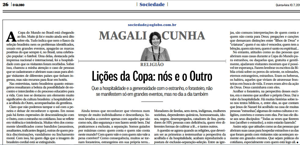 Com o título “Lições da Copa: nós e o Outro”, a professora chama atenção para as pessoas que abriram suas casas para hospedar visitantes de diferentes países, uma oportunidade para o intercâmbio e o aprendizado que só a generosidade e a gentileza podem proporcionar.