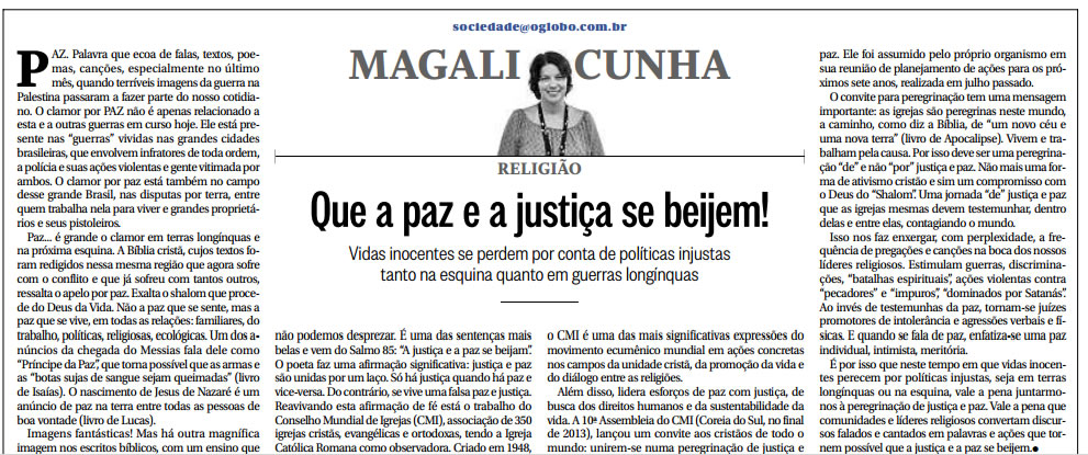 Professora Magali Cunha fala sobre paz e justiça em coluna do jornal O Globo