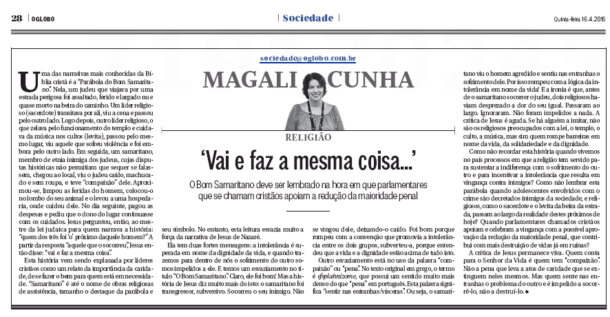 A professora Magali Cunha, docente do Programa de Pós-graduação em Comunicação Social, escreve quinzenalmente, às quintas-feiras, uma coluna para o jornal O Globo. Na edição publicada no dia 16 de abril, o tema abordado foi uma reflexão sobre a parábola do “bom samaritano” e trazendo à discussão parlamentares cristãos apoiadores da redução da maioridade penal.