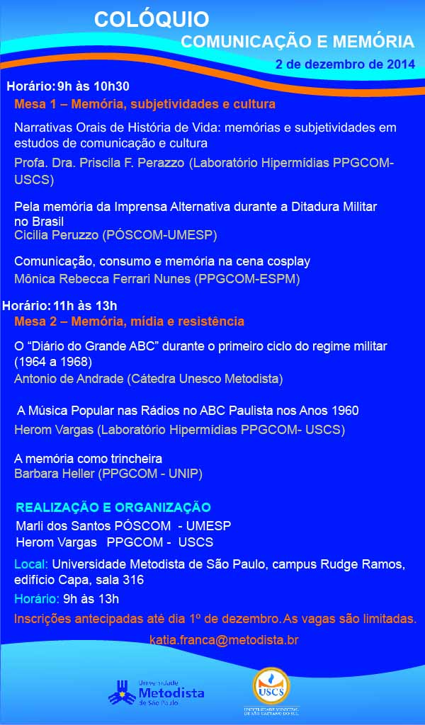 O Programa de Pós-graduação em Comunicação Social (Póscom) da Universidade Metodista de São Paulo promove, nesta terça-feira, 02 de dezembro, o Colóquio Comunicação e Memória. O evento será a partir das 9h, no edifício Capa, sala 316.
