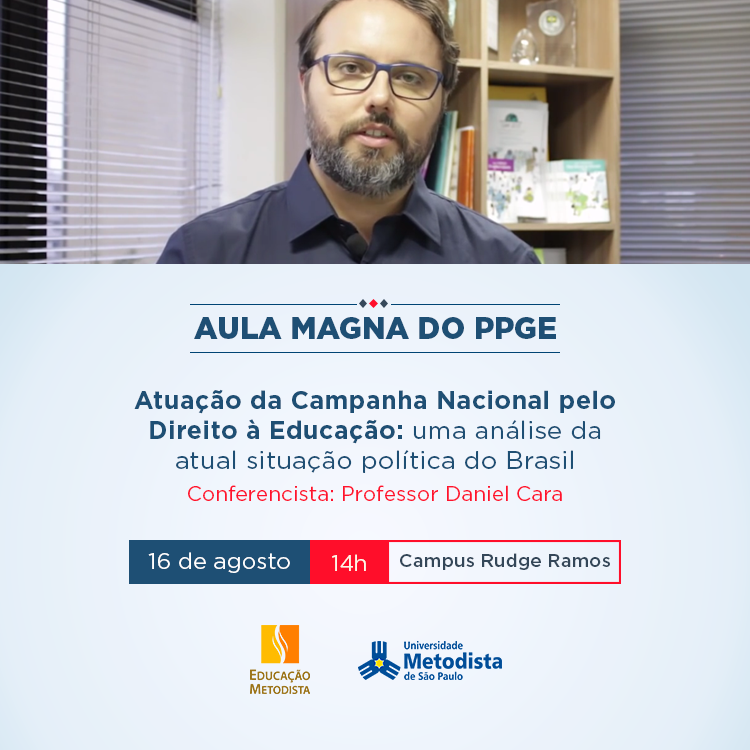 A aula magna da Pós-Graduação em Educação da Universidade Metodista de São Paulo acontece no dia 16 de agosto com a temática "Atuação da Campanha Nacional pelo Direito à Educação: uma análise da atual situação política do Brasil". O professor Daniel Cara é o conferencista convidado e a professora Cassia Alessandra Domiciano atuará como moderadora.