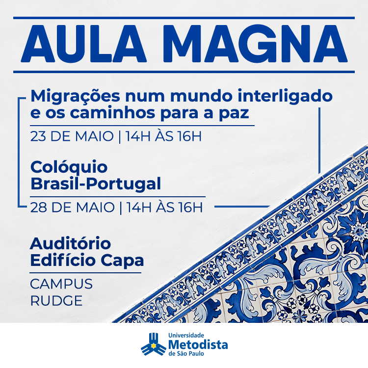 No dia 23 de maio, das 14h às 16h, no auditório do Edifício Capa, acontecerá uma Aula Magna com o tema “Migrações em um mundo interligado e os caminhos para a paz”. Já no dia 28 maio, às 14h, no mesmo auditório, é a vez de ser apresentado o “Colóquio Brasil-Portugal”.