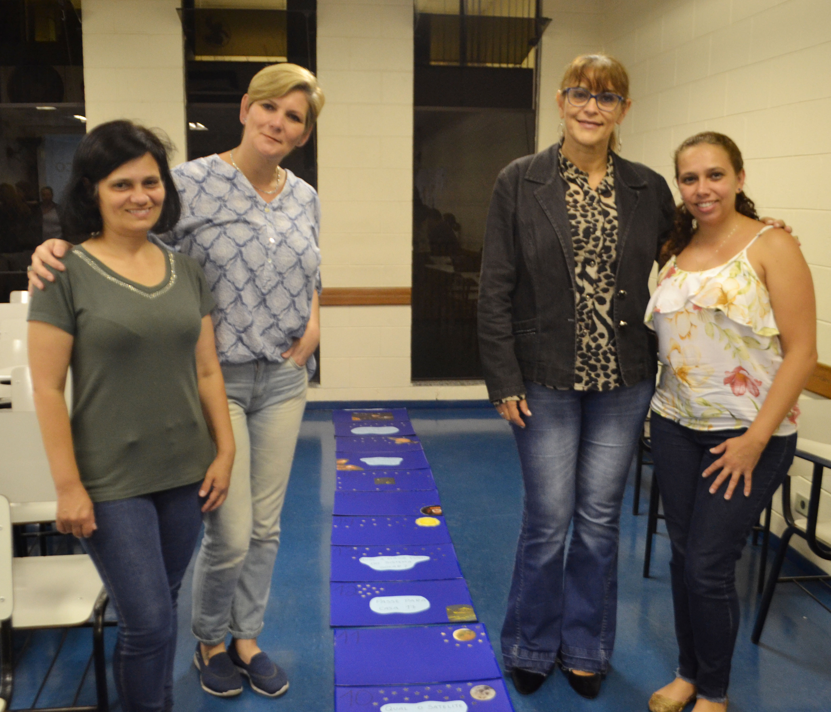 “Adaptamos o Twister para uma proposta interdisciplinar, em que a criança conhece o sistema solar (ciências) por meio de formas geométricas (matemática) e também desenvolve coordenação motora na medida em que vai pulando casas”, explicaram as alunas Débora Zanardo de Oliveira e Érica Cristina Sartorelli sobre o trabalho do grupo denominado Twister Astronômico, em alusão ao jogo de habilidade física desenvolvido sobre um tapete e cujas cores (obtidas depois de girar uma caixa) determinam movimentos de pés e mãos e, no caso, conhecimento de um planeta do sistema solar.