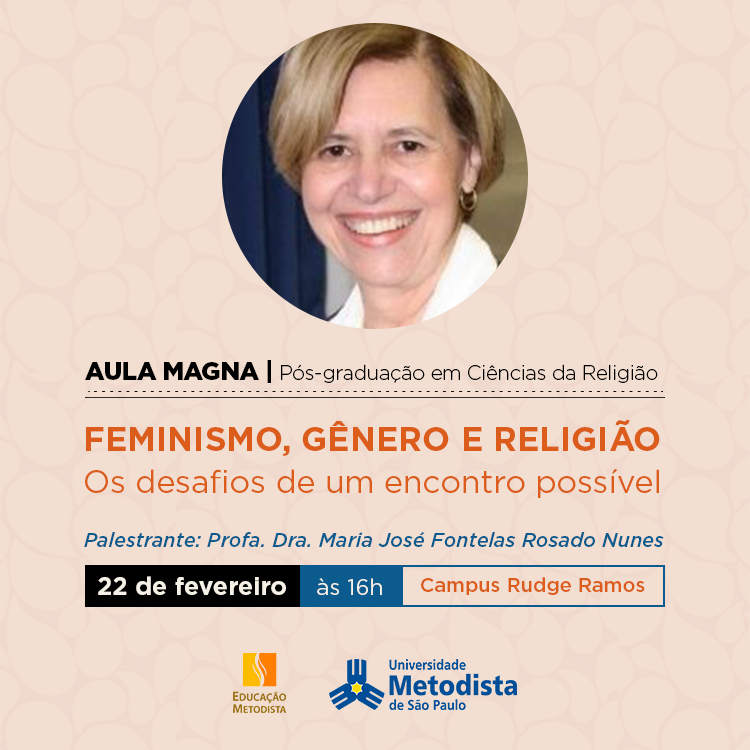 O Programa de Pós-graduação em Ciências da Religião promove nesta quarta-feira, 22 de fevereiro de 2017, a aula magna “Feminismo, Gênero e Religião – os desafios de um encontro possível”, com a professora Maria José Fontelas Rosado Nunes, uma das 51 brasileiras indicadas pela Associação Mil Mulheres pela Paz para receber coletivamente o prêmio Nobel da Paz em 2005.