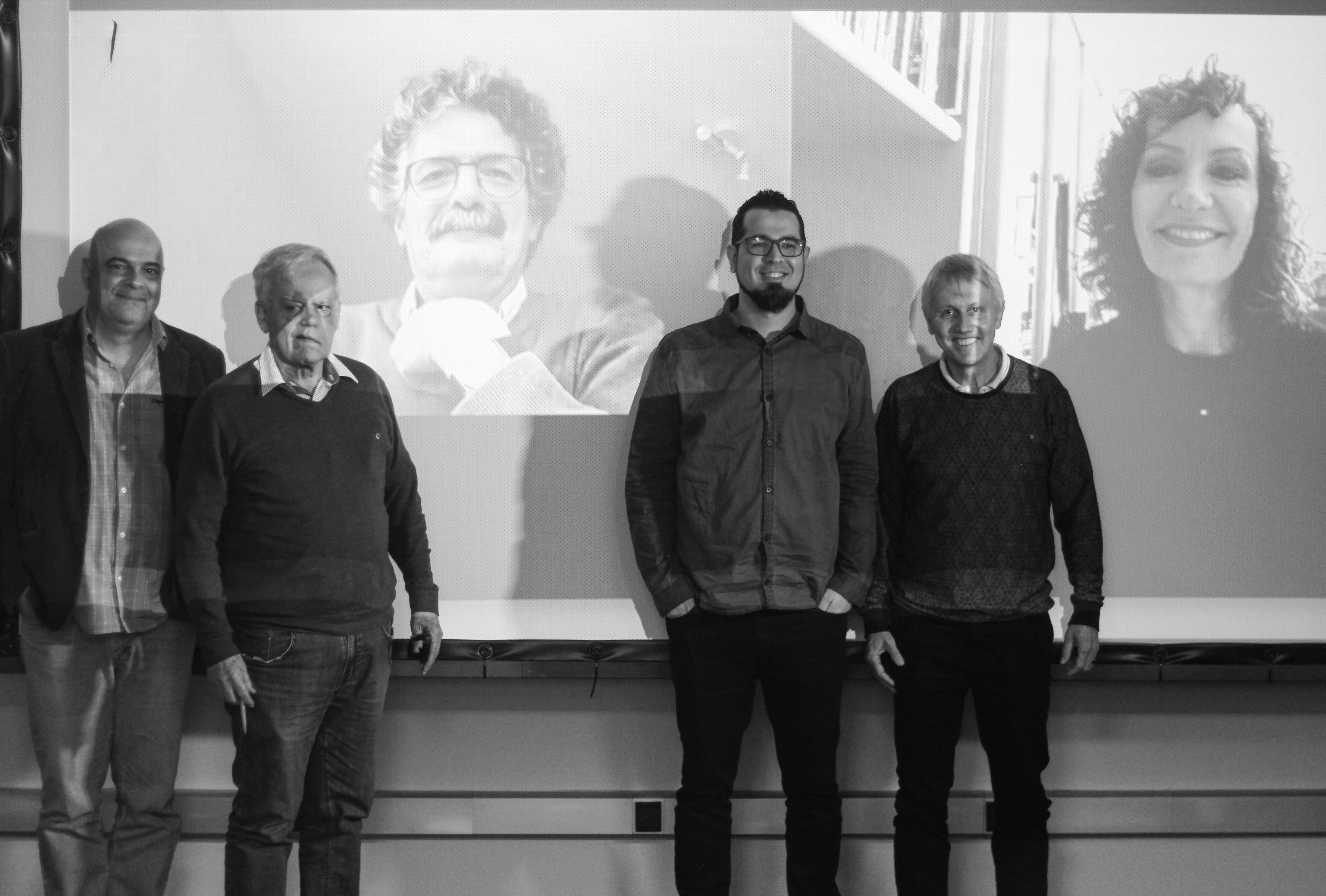 Da esquerda para direita: prof. Paulo Nogueira, prof. Tércio Siqueira, Silas Klein e prof. José Ademar. Projetado no telão, prof. Cristoph Uehlinger e profa. Kátia Pozzer