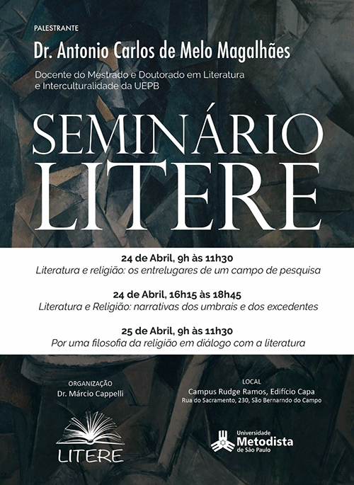 O grupo de pesquisa Literatura, Teorias da Linguagem e Religião (Litere), vinculado ao Programa de Pós-graduação em Ciências da Religião da Universidade Metodista de São Paulo, inicia oficialmente suas atividades nos próximos dias 24 e 25 de abril, com a promoção do Seminário Litere. O evento ocorre na sala 316 do Edifício Capa (campus Rudge Ramos).