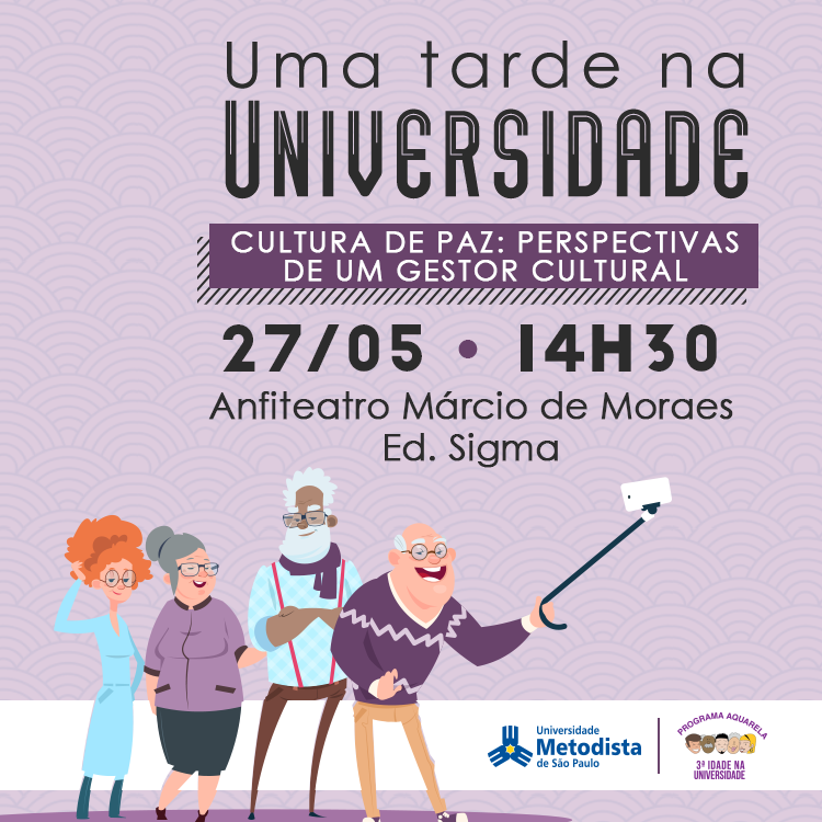 O Núcleo de Arte e Cultura da Universidade Metodista de São Paulo promoverá o encontro Uma Tarde na Universidade, uma das ações do Programa Aquarela – 3ª Idade na Universidade, que será realizado na tarde de 27 de maio, a partir das 14h30.