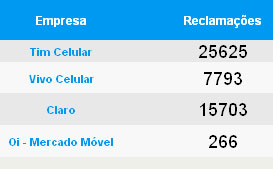 O ranking do maior site de reclamação de consumidores na internet é dividido entre empresas de telefonia celular e lojas virtuais. As operadoras estão amplamente representadas pelas quatro maiores empresas do setor. A Tim, grande vencedora no numero de reclamações, ficou com a medalha de ouro, a Claro é bronze, Oi com a 8º posição e a Vivo em 14º. Mérito nenhum deve ser honrado por essas empresas que devem organizar-se para reverter tal situação.