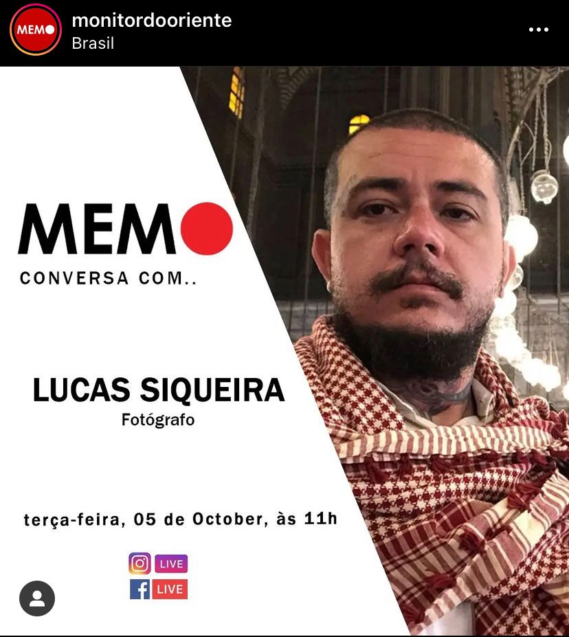 Na última terça-feira (05), o documentarista e fotojornalista, Lucas Siqueira, foi entrevistado por Fábio Bosco, da instituição MEMO (Monitor do Oriente) sobre o Oriente Médio e seu atual momento, com foco em alguns países específicos. O evento foi transmitido pelo Instagram – link abaixo – e contou com audiência de um público bem diversificado, o que enriqueceu ainda mais a entrevista. Dentro do tema foram abordados alguns assuntos como, a questão dos refugiados no Oriente Médio, o atual momento da Palestina e, a Islamofobia.