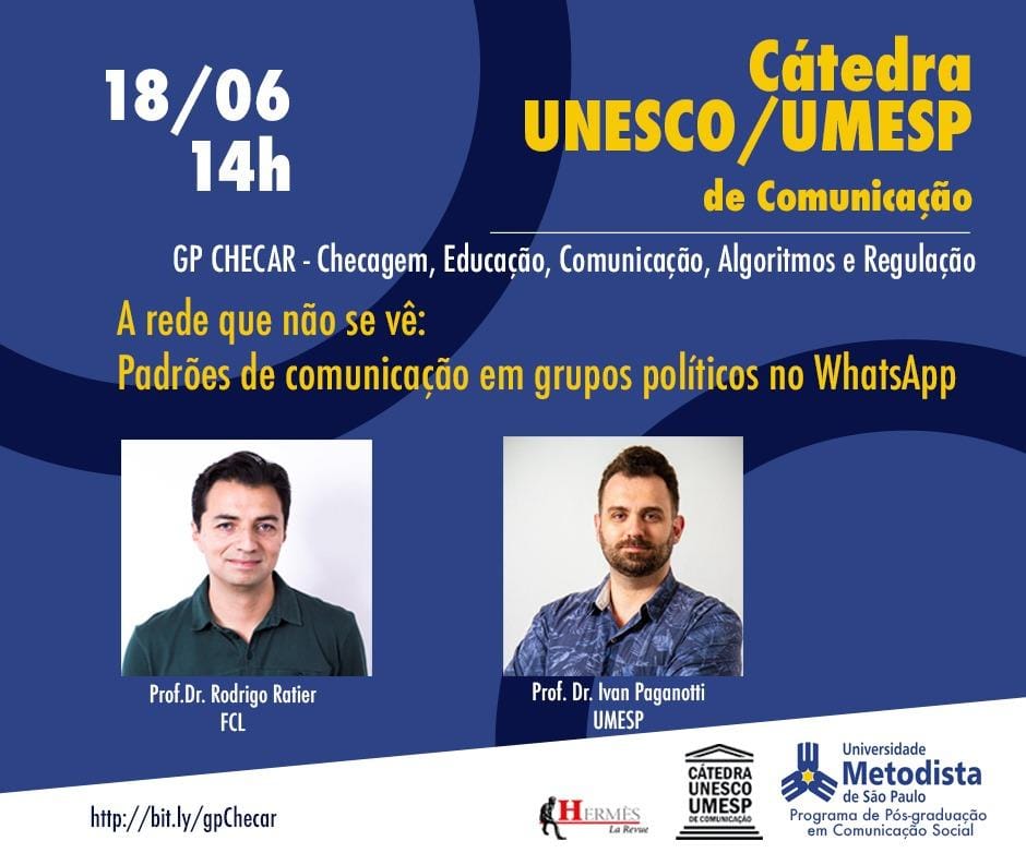 A Cátedra UNESCO/UMESP de Comunicação e o grupo de pesquisa Checagem, Educação, Comunicação, Algoritmos e Regulação (CHECAR), vinculado ao Programa de Pós-Graduação em Comunicação Social da Universidade Metodista de São Paulo (PósCom-Umesp) promoveram webinário para discutir como grupos políticos emergentes utilizam aplicativos de mensagem instantânea para mobilizar usuários e aproximar lideranças de suas bases. O evento, moderado por Ivan Paganotti, coordenador do grupo CHECAR, recebeu o pesquisador Rodrigo Ratier, da Faculdade Cásper Líbero, que apresentou a pesquisa “Império opaco: mapeamento da expansão da rede bolsonarista no WhatsApp”, recentemente publicada na revista Verbum, da PUC-SP. Após a apresentação online, na tarde de 18 de junho de 2021, os participantes do grupo CHECAR – composto por mestrandos, doutorandos e bolsistas de Iniciação Científica da Umesp – puderam discutir com o convidado os principais resultados e atualizações de sua pesquisa, incluindo o uso de aplicativos de mensagem instantânea para a proliferação de informações falsas, discurso de ódio e ataques à instituições tradicionais, como os poderes legislativos, judiciário e a imprensa. A partir de sua observação de grupos políticos, Ratier apresentou a organização de grupos em cadeias de disseminação, avaliando o perfil dos usuários mais ativos e os conteúdos políticos mais difundidos.