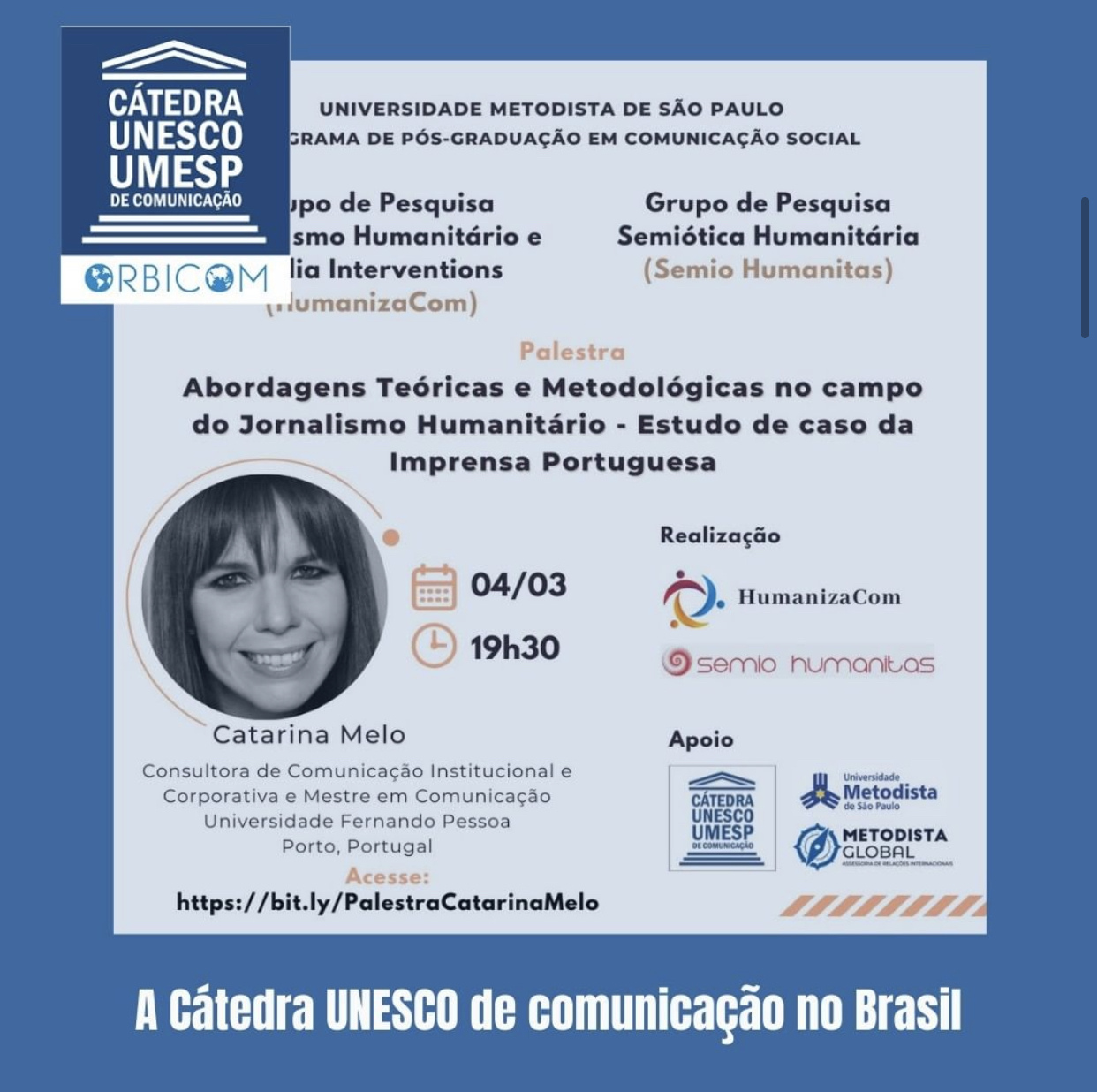 No dia 4 de março as 19h30, ocorrerá uma palestra sobre a abordagem teórica e metodológica no campo do jornalismo humanitário na imprensa portuguesa.