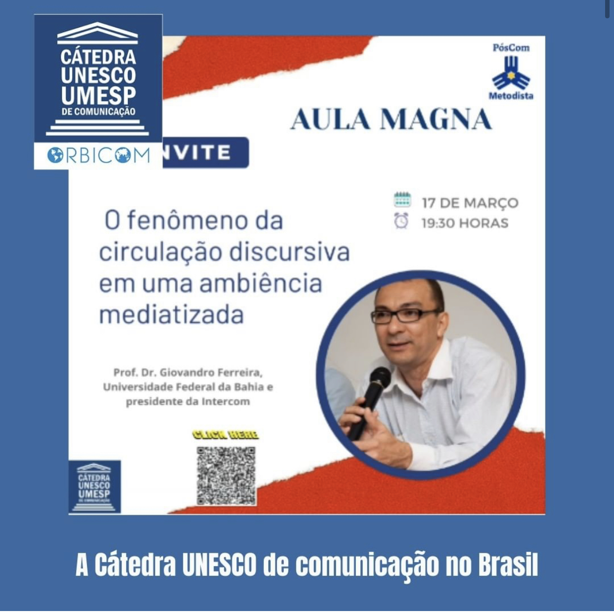 No dia 17 de março as 19h30, acontecerá a Aula Magna, realizada pela PósCom Metodista com apoio da Cátedra UNESCO/UMESP de Comunicação. “O fenômeno da circulação discursiva em uma ambiência mediatizada”, será o tema da aula, que será ministrada pelo Prof. Dr. Giovandro Ferreira, da Universidade Federal da Bahia e presidente da Intercom.