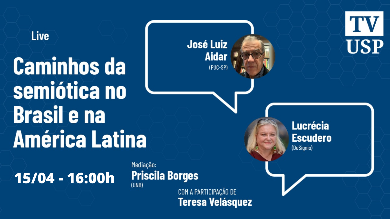 Dia 15/04, às 16h, live sobre os "Caminhos da Semiótica no Brasil e na América Latina" acontece no canal do YouTube da TV USP. Priscila Borges (UNB) conversa com José Luiz Aldair (PUC-SP) e com Lucrécia Escudero (DeSignis).