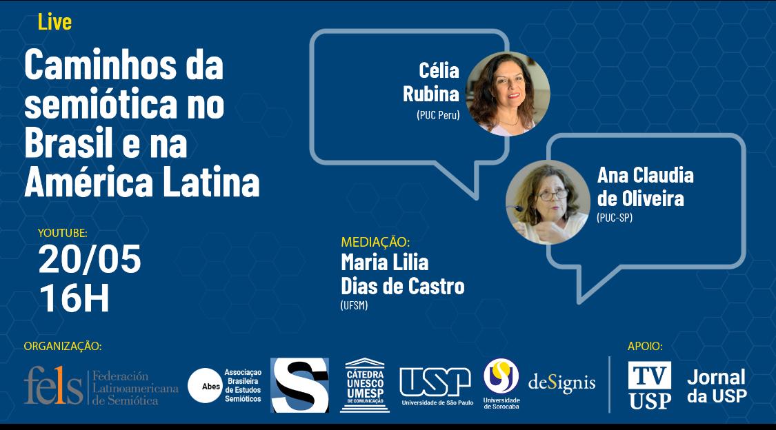 Dia 20/05, às 16h, live sobre os "Caminhos da Semiótica no Brasil e na América Latina" acontece no canal do YouTube da TV USP. Maria Lilia Dias de Castro (UFSM) conversa com Célia Rubina (PUC Peru) e Ana Claudia de Oliveria (PUC-SP).