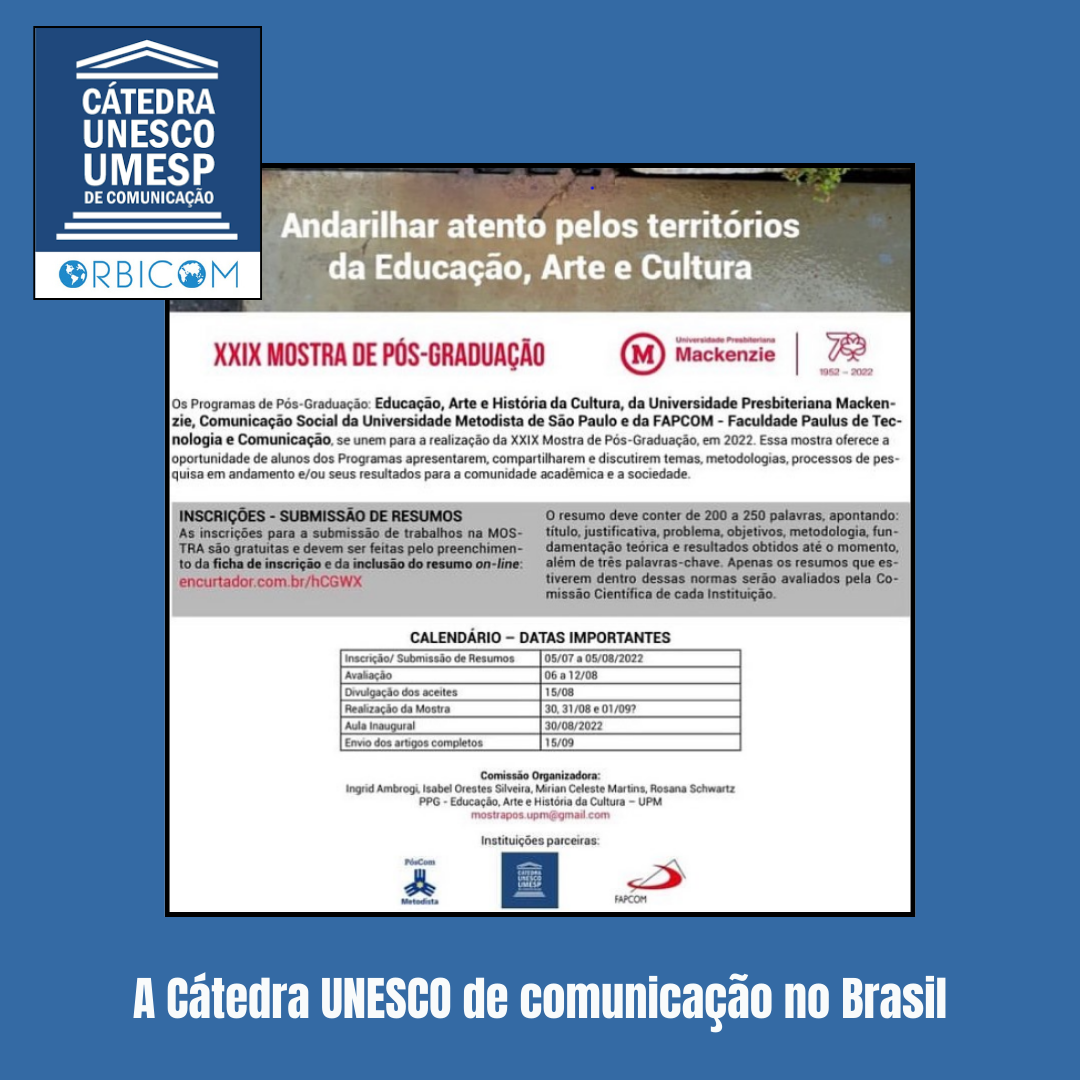 Os programas de pós-graduação em Comunicação Social da Universidade Metodista de São Paulo, Arte e História da Cultura da Universidade Presbiteriana Mackenzie e a Faculdade Paulus de Tecnologia e Comunicação, se unem para a realização da XXIX Mostra de Pós-Graduação.