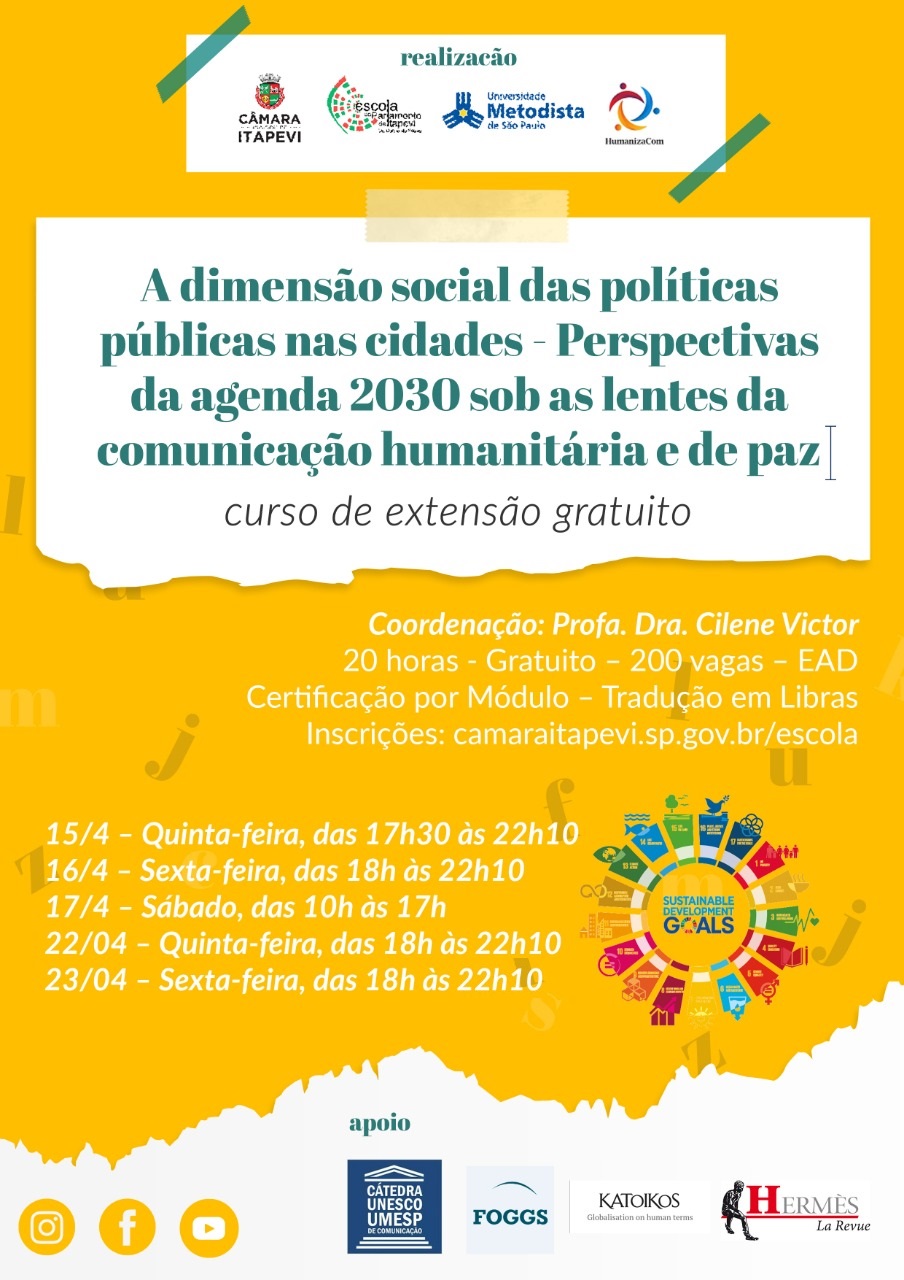 O curso de extensão gratuito “A dimensão social das políticas públicas nas cidades – Perspectivas da agenda 2030 sob as lentes da comunicação humanitária e de paz” está com inscrições abertas até o dia 10 abril, através do site camaraitapevi.sp.gov.br/escola. O curso, coordenado pela professora e doutora Cilene Victor, da Universidade Metodista de São Paulo, terá duração de 20 horas e um total de 200 vagas.