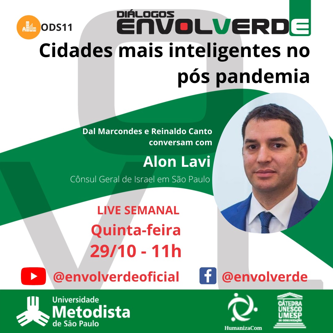 Nesta quinta-feira (29/10), às 11 horas, Diálogos Envolverde conversa com Alon Lavi, o Cônsul Geral de Israel em São Paulo, sob o tema "cidades mais inteligentes no pós pandemia". O encontro acontece no canal do YouTube da Envolverde.