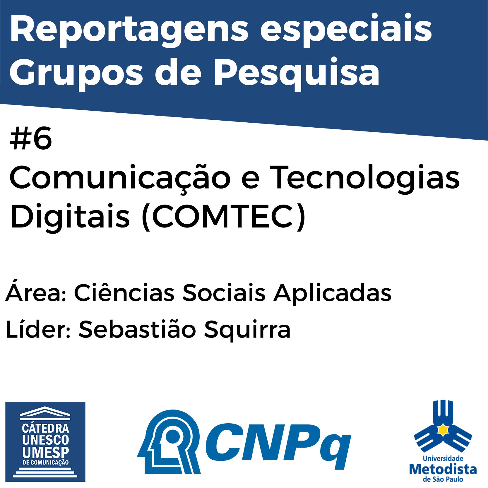 O sexto grupo a ser explorado nessa série é o Comunicação e tecnologias Digitais, (COMTEC) que teve início em 2004 e é liderado pelo professor Sebastião Carlos de Morais Squirra, do programa de Pós-Graduação em Comunicação Social da UMESP.