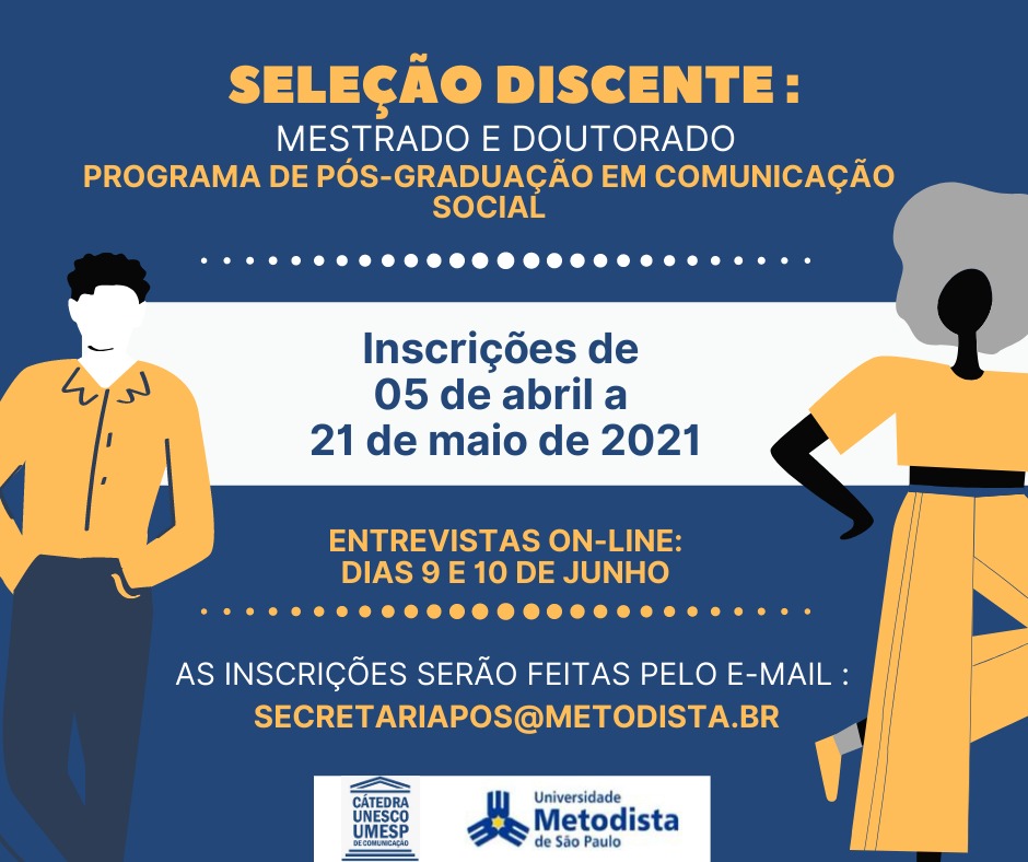 O programa de pós-graduação (mestrado e doutorado) em comunicação social da Universidade Metodista de São Paulo está com as inscrições abertas, de 05 de abril a 21 de maio. As entrevistas com os candidatos serão realizadas, de forma online, nos dias 9 e 10 de julho. Para se inscrever, envie um e-mail para: secretariapos@metodista.br