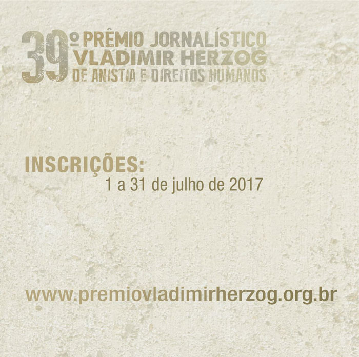 A partir de 1º de julho, jornalistas, artistas do traço e repórteres fotográficos de todo o Brasil poderão inscrever suas produções para concorrer ao 39º Prêmio Jornalístico Vladimir Herzog de Anistia e Direitos Humanos. Considerado entre as mais significativas distinções jornalísticas do país, o Prêmio Vladimir Herzog tem abrangência nacional e reconhece, ano a ano, trabalhos que valorizam a Democracia, a Cidadania e os Direitos Humanos.
