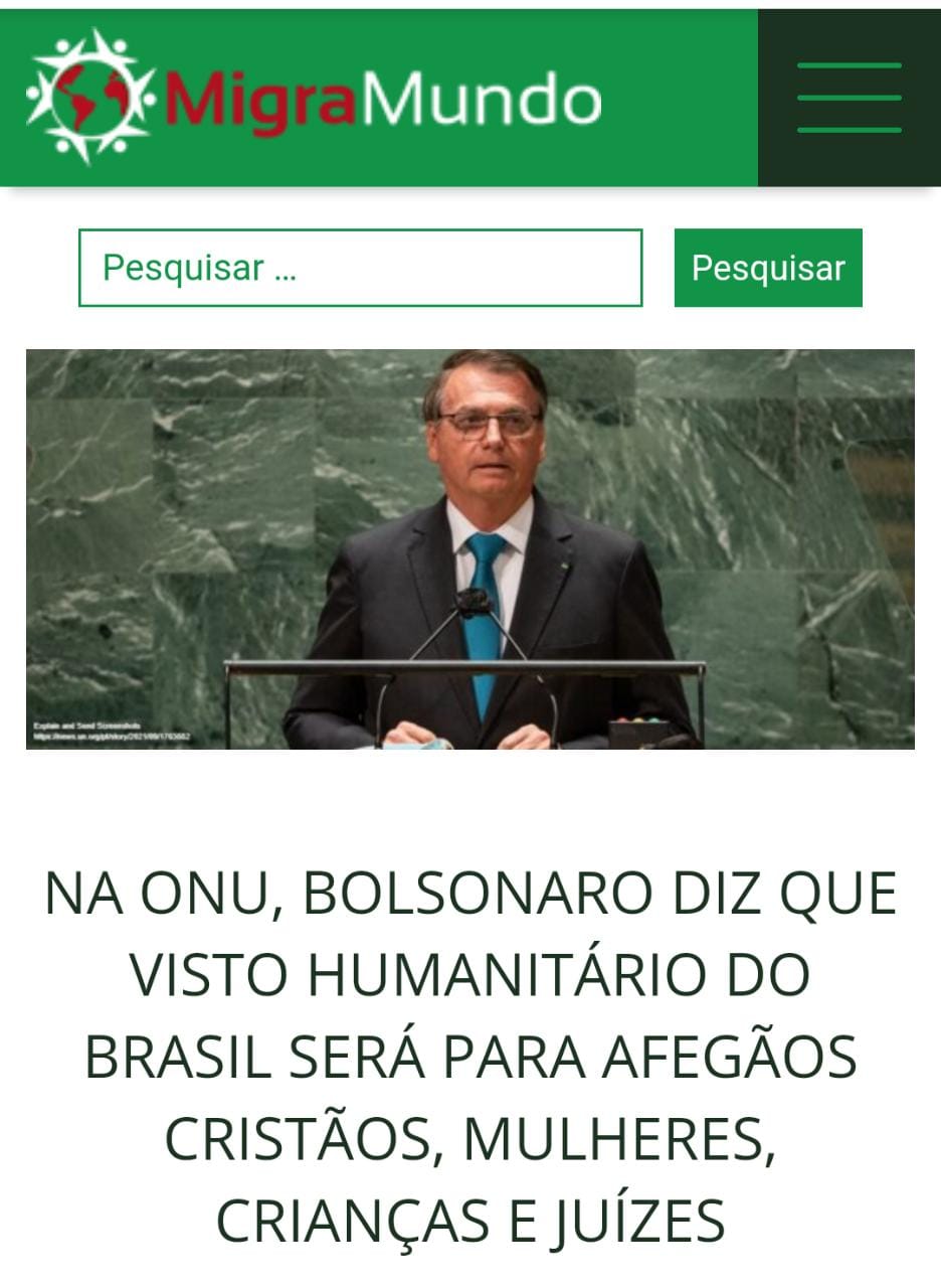 Leia a matéria completa em : Na ONU, Bolsonaro diz que visto humanitário do Brasil será para afegãos cristãos, mulheres, crianças e juízes | MigraMundo