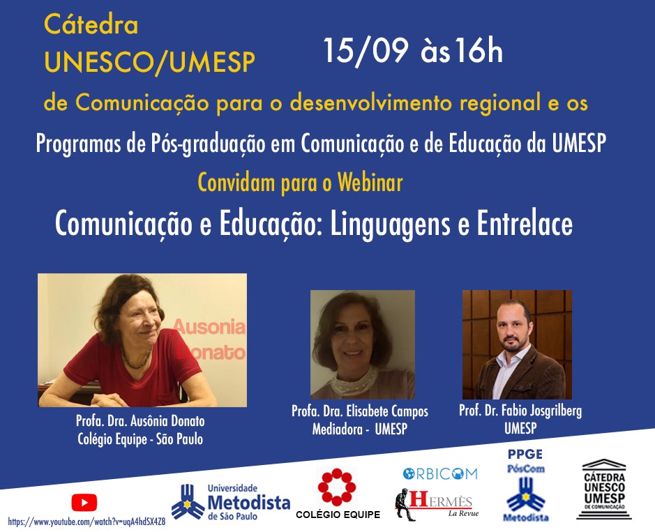 A Cátedra UNESCO/UMESP de Comunicação para o desenvolvimento regional e os Programas de Pós-graduação em Comunicação e de Educação da UMESP , convidam para o webinar " Comunicação e Educação: Linguagens e Entrelance